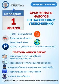 Срок уплаты налогов по налоговому уведомлению не позднее 1 декабря